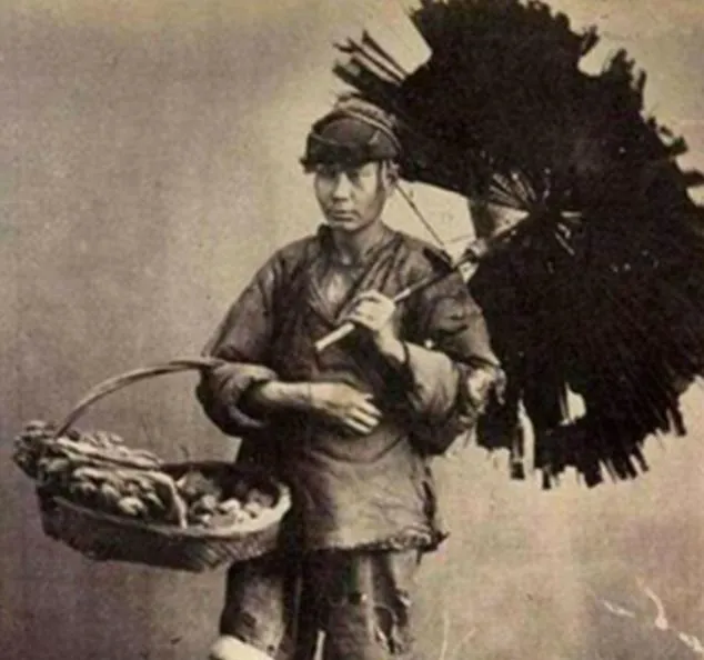 这位是卖货郎,肩后那把伞骨头早散了,布面像鱼鳞片一样裂开,篮子里是鸡蛋和野果,他不喊,也不笑,脚往前迈一步,影子就跟着斜一步。