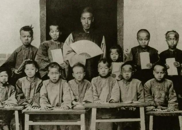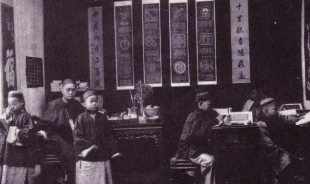 图中屋里这叫私塾,墙上挂着长条字帖,先生坐案几后,孩子们一人一本三字经,读到拗口处就拖长了调,后来学堂起来,接线房里一排排的人戴着耳机拨线,线嘀嗒作响,那会儿我们家老舅去县里见过,说这玩意快过飞鸽传书多了。