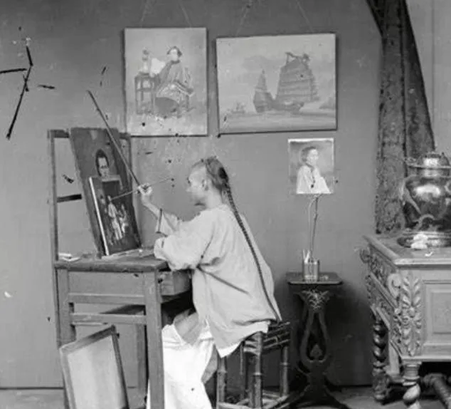 这个屋子叫影像画室,墙上挂着船和洋人像,桌上摊着调色盘,画师长辫子垂到椅背,手腕一抬一落,油彩在布面上亮开,先生说那时叫中西合璧,画出来的人物有影子也有光。
