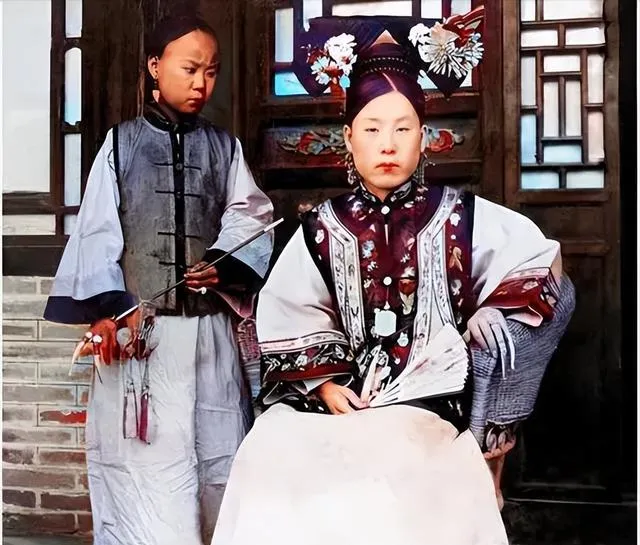 这一身是旗装,头上花钿压得沉,胸前坠子一串一串,旁边使女手里捏着小扇,主母眼神冷,像说了句别靠太近,家里规矩是规矩,拍照也不破。