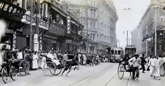 这两张是大城的街,道旁铺子挤着挂牌子,车夫弯腰往前拉,电车叮的一声过站,凤祥银楼那块匾在风里晃,买卖人抬头一看,就知道门路到了。