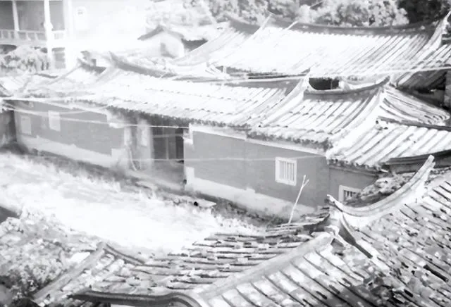 一张是官服像,胸口补子绣着鸟,帽穗垂在一侧,面前摆着玻璃球灯,另一张是屋脊连着屋脊,瓦上生了白霜,雨沟里还积着水,老屋守着年月,像个不多话的老人。