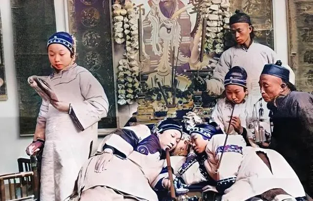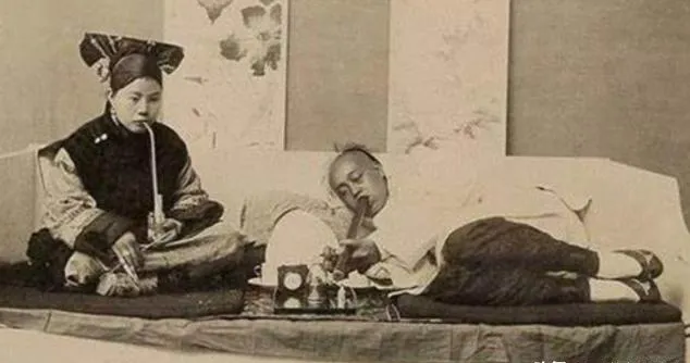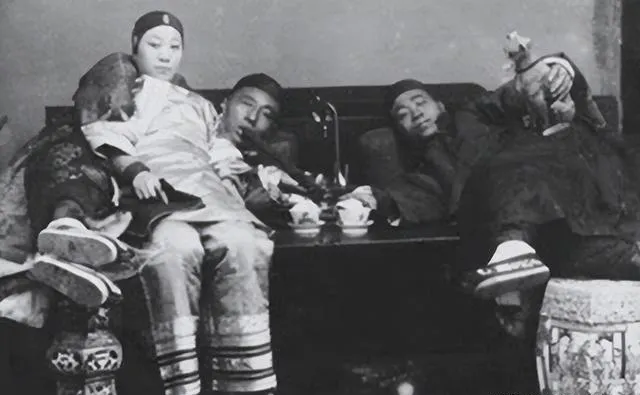 这三张合在一处看更扎心,女子端坐抽细长烟枪,旁边一群人靠在一处眼皮打架,最后这对一躺一坐,茶具列在前头,白瓷盏里还有水光,别问滋味咋样,照片已经把答案放在脸色上了。