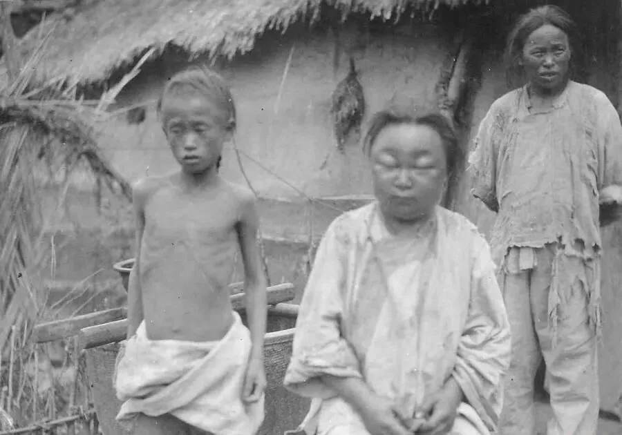 这个样子叫饿浮,脸肿得没了棱角,眼皮像被水泡过,孩子肋骨一根根挑着皮,站都站不直,照片边上是土坯房和草檐,锅台冷得发白,奶奶说那年灾里,村口树上挂着告示,谁家有多余的稗子壳和红薯蔓都往祠堂送,熬一大锅稀汤,先给小娃分,味道淡得像喝风,可那就是命。