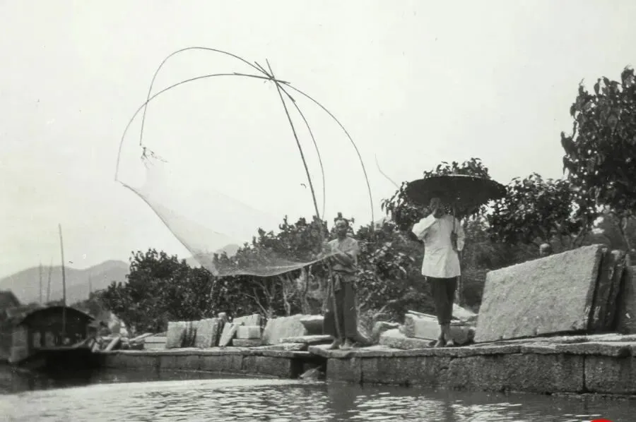 这个方口大网叫罾,四根细长竹竿拱成弓背似的形,网眼疏密分得清,抬网时水珠一串串掉下去,清脆得很,岸边一人撑伞挡日头,一人握着横杆抖腕子,等鱼影在网心一聚,猛地一提,嗖的一下就收上来了,我小时候在南方亲戚家见过简易的小罾,竹竿削得光溜溜,抓在手心凉飕飕的,现在电鱼声名狼藉,讲究的人又把罾拾回来了,说是慢慢等,比快活更有味。