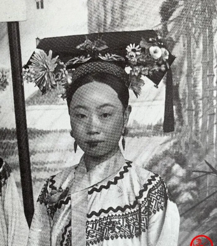 这位小主头上是大拉翅,黑呢子打底两边挑花,鬓角贴花钿,耳畔坠子细细晃,衣襟绣密格纹边,眉眼还带着点稚气,照片后景画成园林样,虚虚的,奶奶说王府里女孩儿多,跟着老佛爷唠嗑下棋是雅事,规矩也多,行走要并脚,笑不能露齿,现在孩子拍证件照都要修图,那会儿一张底片留几十年,一回定终身气质。