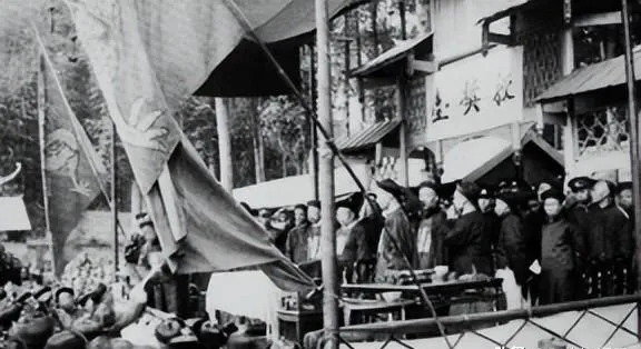 这一排长衫和缨帽是授业会,台上举手的是颁赏的先生,旗子猎猎响,鼓点密密敲,台下有人踮脚张望,有人把孩子往前托一托,盼着榜上有名,回去能撑起一桌酒。