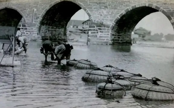 桥洞下这一圈箩样的叫竹筏桶,里面压着石头稳住,男人弯腰摸鱼,手背上的青筋鼓鼓的,水面起一层涟漪,孩子蹲在岸边数桶,数着数着就饿了。