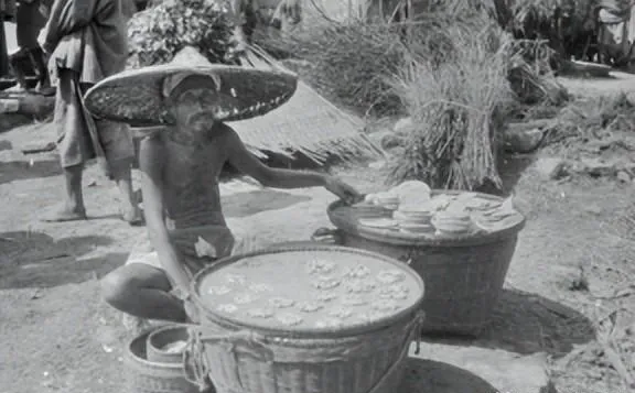 这两口大篮配一锅是饼子摊,糊糊在锅里起泡,揭起来边缘焦黄,摊主戴一顶大草帽,手腕一抖甩到簸箕上,撒把葱花就能卖掉。