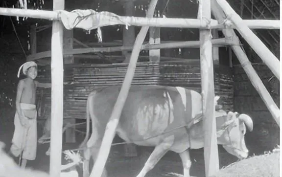 这木圈圈叫碾槽,牛眼睛温顺,少年牵着缰绳跟着走,脚底下泥印一个接一个,碾出来的谷子干净利落,磨出来的面更细点。