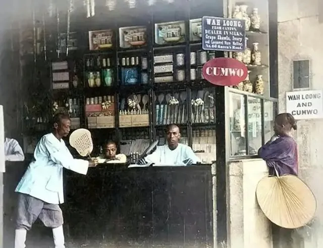 这格子满墙的是洋货铺,玻璃罐里装着糖和洋墨水,伙计拿算盘啪啪打,客人手里摇着蒲扇,问有没新来的肥皂牌子,老板眯着眼笑说“有有有”。