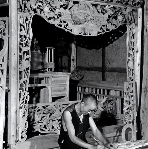 这张立着花板的是婚床,榫卯咬得紧,镂空牡丹一片片翻着卷,师傅刨子顺木纹走,木屑像金粉一样落一地,妈妈说,成亲住这样的床,日子有盼头。