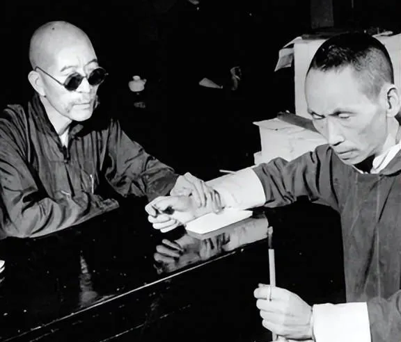 这副圆墨镜的是老中医,三指搭在脉门,另一只手执笔写方,病人眉头紧锁,像在和身体讨价还价,旁边柜子里整整齐齐摆着药斗。