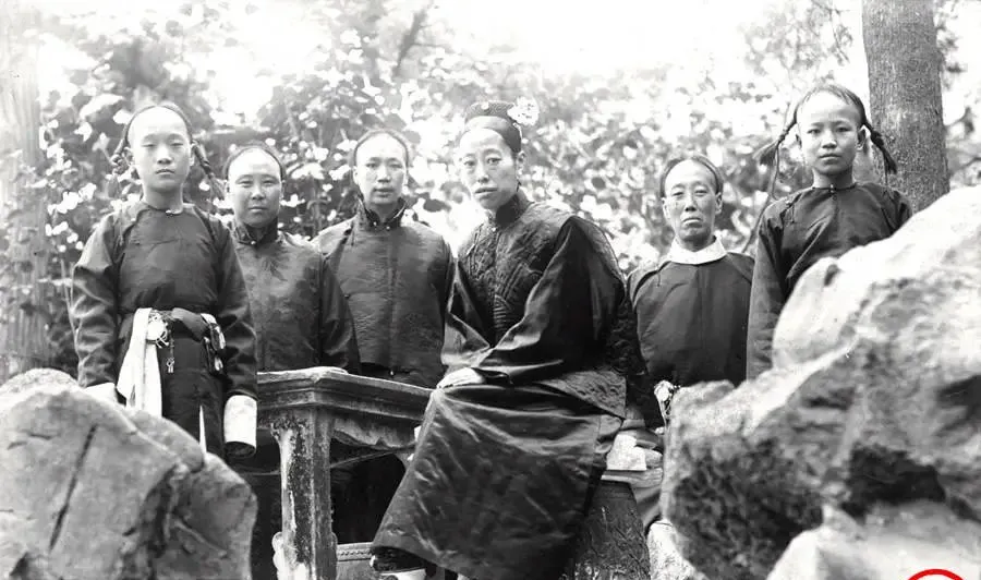 这个园中的合影更真实些,几位亲眷在山石边坐着,树荫压下来,石桌面光冷,衣料是素色缎,纹样不抢眼,中间那位神情淡淡的,是个懂分寸的人,身后站着的两位男子,腰间坠了物件,像是随身的荷包或香筒,细看能见缝线,很结实。