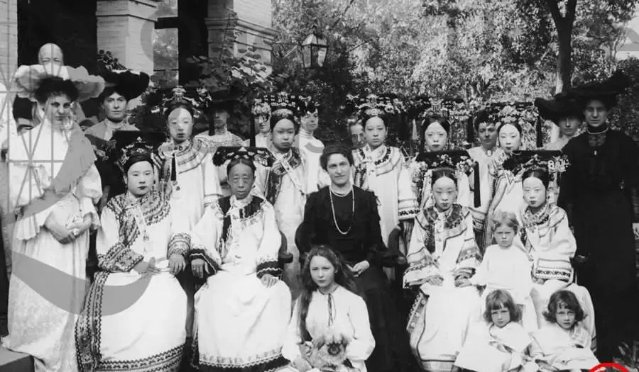 这张大合影热闹,前排坐着慈禧身边的女眷与几位洋女士,小孩儿穿着白裙,抱着小狗,背后是满院的花树与廊柱,满洲的花钿对着西式的大檐帽,谁也不嫌谁奇怪,大家端端正正坐着,看镜头的眼神却是好奇的。