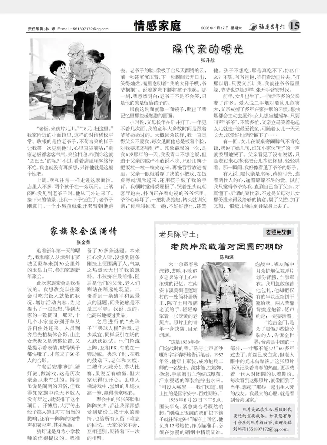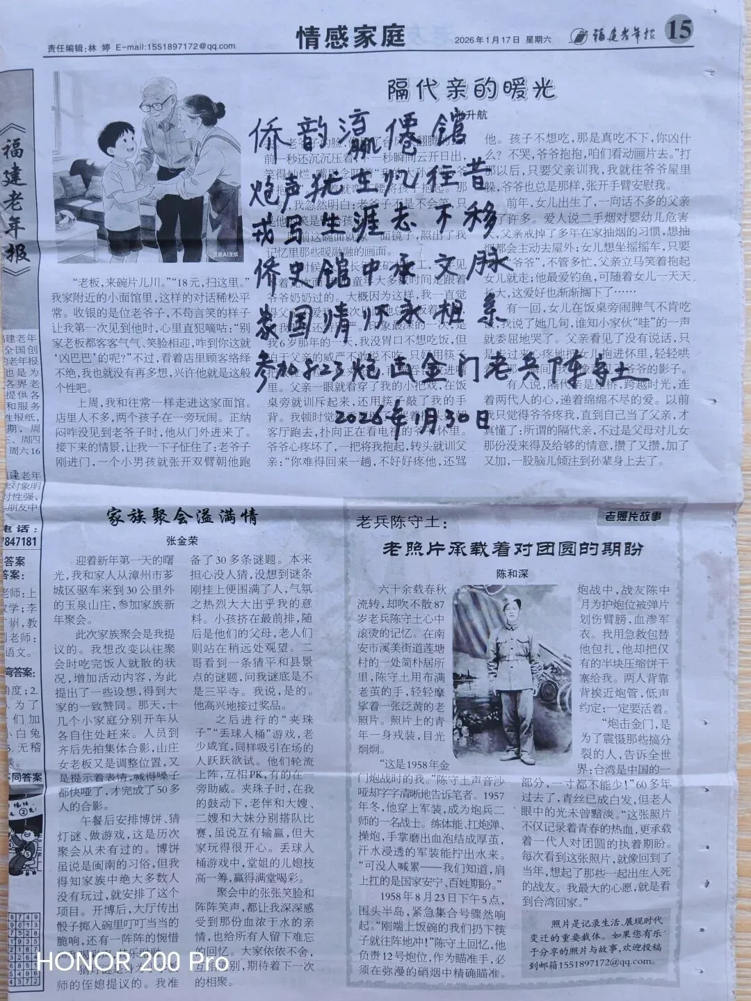 ▲87岁老兵陈守土收到《福建老人报》激动万分!他说:“回忆里的炮火声,如今化作幸福的日常,祖国统一是最大的期盼。”