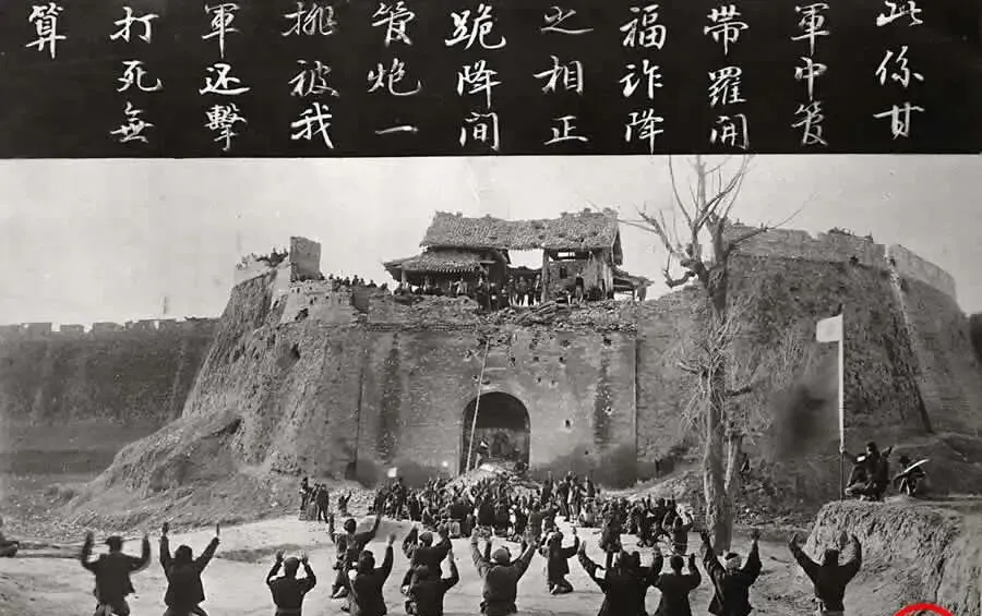 图中举手的人群与塌了口的城门口,叫一场“诈降变火并”的收场,黑压压的围观里有人高喊有人跪举枪,风沙里连旗子都直抖,老照片上方一排字像是当场的旁白,谁骗谁、谁先开炮,一目了然,城墙上瓦砾吊着没掉下去,像最后一点体面,爷爷当年指着类似的城照说,打仗最怕的不是拼命,是有人变卦,这话搁现在听着也扎心。