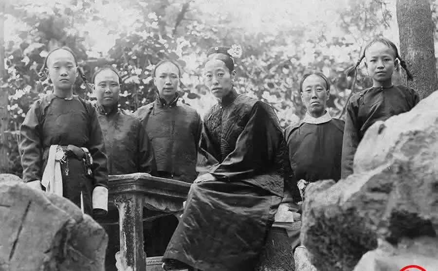 石桌边坐一位,左右侍立几人,叫“院子里的合影”,树影斑驳,衣料都是暗色,发髻一丝不乱,谁是谁不必细认,只看得出那种规矩里的疏离,近在咫尺,各自有各自的心事,照片这种东西怪,越整齐越显得不亲近。