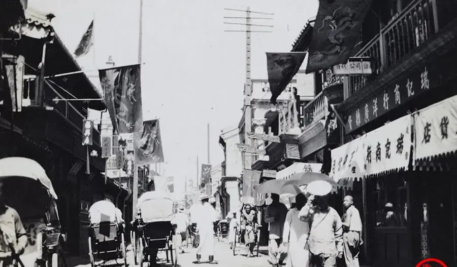 这条街的旗子全飘着龙纹,叫“复辟时的门面”,阳伞、黄包车、招牌影子叠成一锅热汤,日头正毒,铺子门口的伙计半眯着眼,旗多货少,像临时加的戏码,叔叔看见这张乐了,说这不就跟今天换门头打折季一个路子,热闹三天,日子还得照常过。