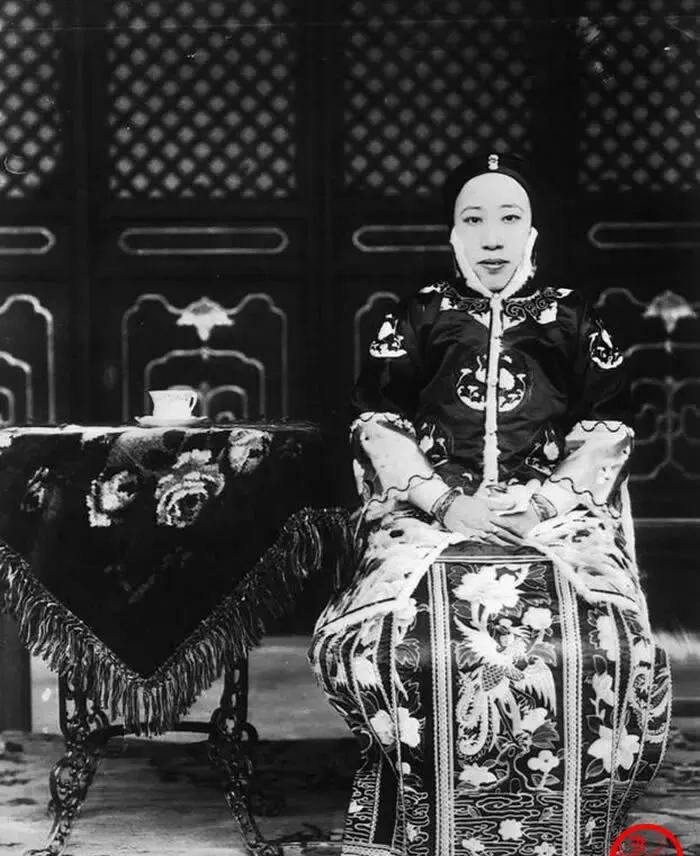 图中这位端坐的,是太后出门歇脚的那一刻,身旁小桌罩着绒面桌布,茶盏盖儿端端正正,衣襟纹样一层层压下来,脸上映着院子的亮光,表情不喜不怒,像在心里打算盘,太监们不在画面里却能想见站在不远处的影子,以前讲究的是阵仗与分寸,现在出门谁还端这么多程序,人嘛,还是图个舒服。