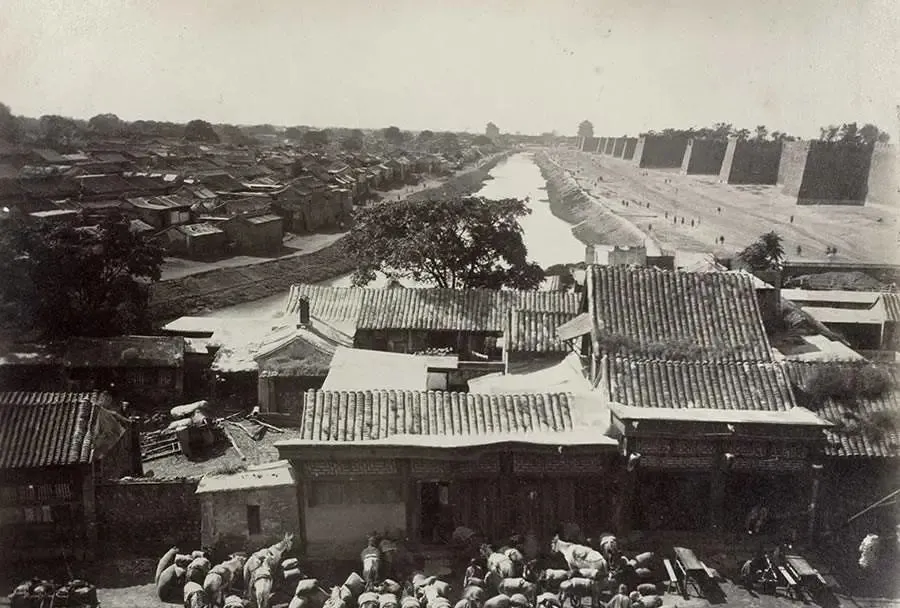图中这片高墙配着一线水沟叫护城河与城垣,灰砖垛口一字排开,河道像一把钝刀,把内外城割出界限,屋顶多是灰筒瓦,挤挤攘攘贴着河岸生长,我外公总说老北京的风是从墙缝里钻出来的,冬天刮过来割脸,夏天吹过来带着泥腥味儿,现在城里修的是景观河,护栏刷得锃亮,走夜路也有灯,这会儿看这一排影子里的人影子,心里咯噔一下。