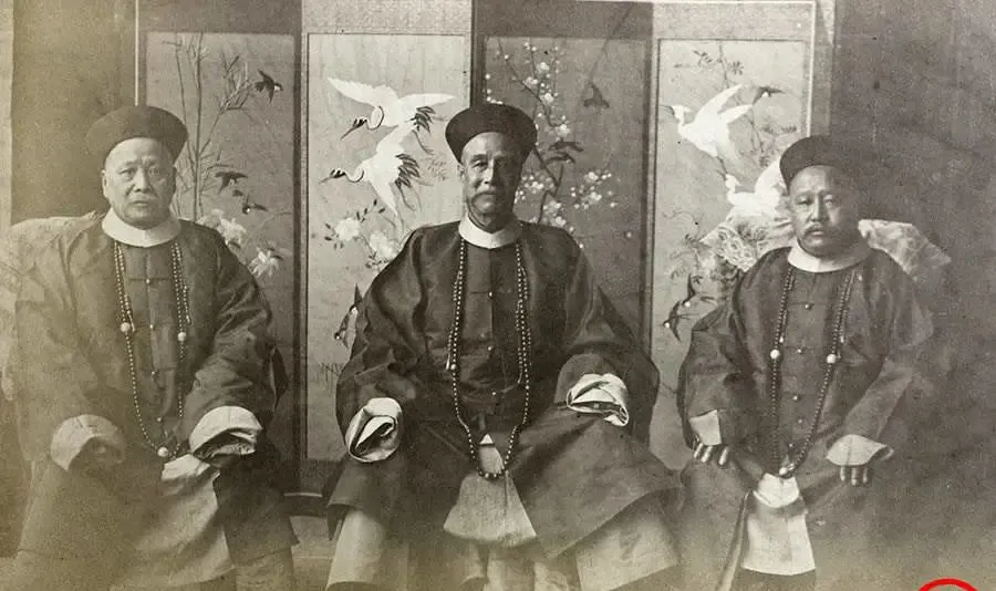 这个端坐合影里的人叫朝廷官员,胸前一串一串的是朝珠,衣领硬挺,袖口翻得圆润,背后屏风上鹤与梅对着摆,神情不严也不笑,像是刚从公事里抽了口气,爷爷盯着那串珠子说,文官五品以上才配戴,别看只是串子,分量不轻,戴久了肩膀也酸,现在的领导合影多半带笑,镜头怼近了也不怕,这张老照片里,人与权的距离就隔在那一层影子里。