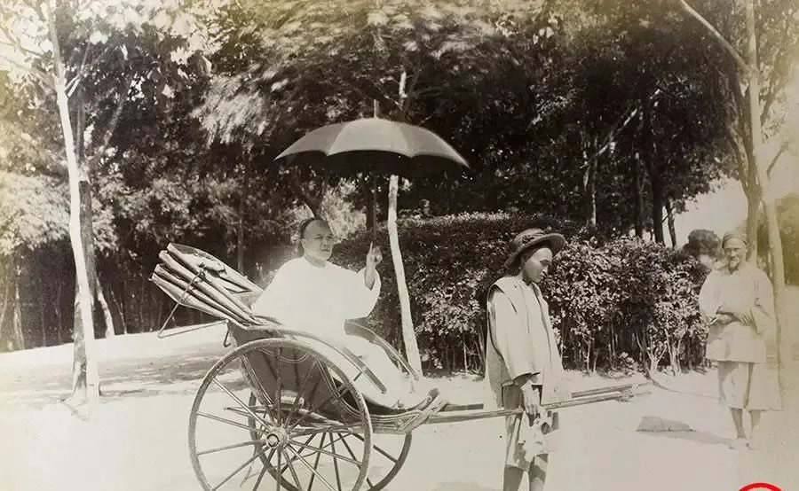 这个单轮大辐的交通工具叫人力车,车厢后头折着篷,乘客手里撑着伞,车把前端细细的一根木梁,拉车的少年低头用力,脚底多半是土路,夏天一阵风把汗味子和树叶味儿一块卷过来,妈妈说那会儿坐车讲究也分三六九等,黑纱篷遮阳才体面,这张里只见防雨布,想来也热得很,现在谁还打伞坐车呀,地铁一穿城,五公里像挪一步。