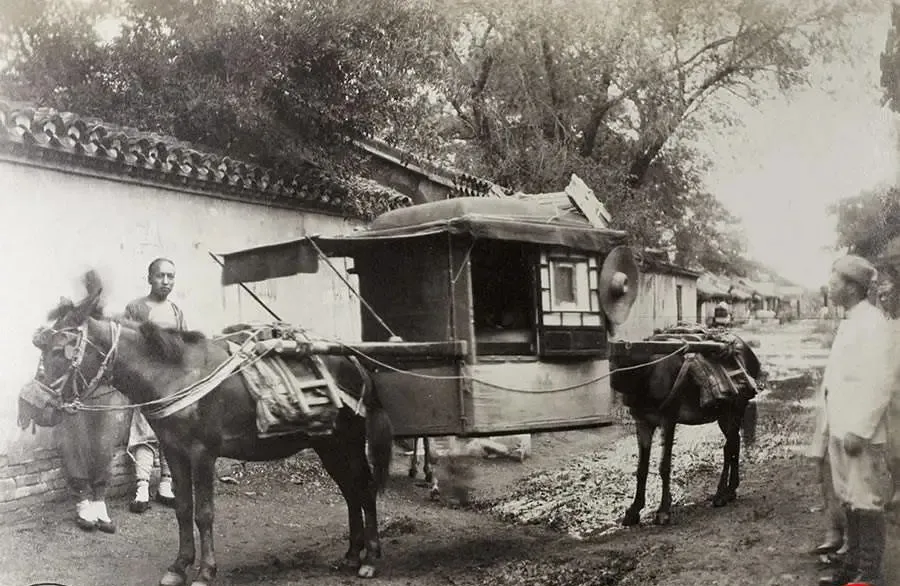 这个两头牲口架着的坐具叫骡驮轿,木框方方正正,窗棂上糊着纸,轿身外面用布包了一层,缰绳绕在骡鞍上,轿内多半有软垫,走起来没有人抬轿那股颠簸劲,听老人说坐着更稳当,远路不累,雨天也不怕,照片里地上湿淋淋的一片,车辙里积着水,想来一脚能陷进去半只鞋,现在城市里偶尔见到模拟老轿子,多半是给游客拍照的,真正把人从一处送到另一处的工作,早交给了发动机。