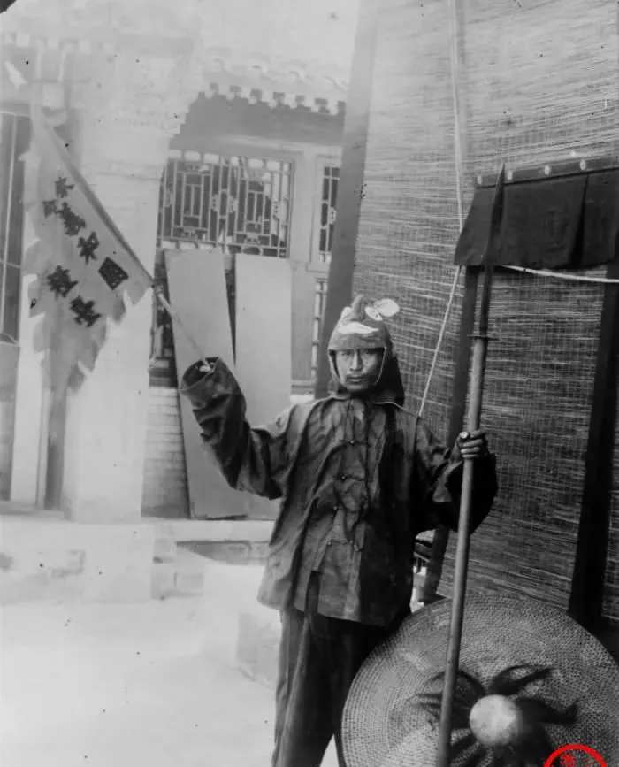 图中这面旗叫粮台旗,粗布做的,边上剪了锯齿穗,杆子是竹或木,顶上插个小穗头,旗面上写着钦命二字,扛旗的这位穿着油亮的雨布褂,袖口宽大,手里还握着一杆长柄刀,像是临时拼的行头,却把阵势摆得足足的,老辈人讲,行军打仗光靠嘴不成,吃粮是头件事,旗子一到村口,里正就得张罗米面菜蔬,谁家出几升都明明白白记着,到了现在,征粮的活早没了影,留在相片里的是一身风霜和一腔蛮劲。