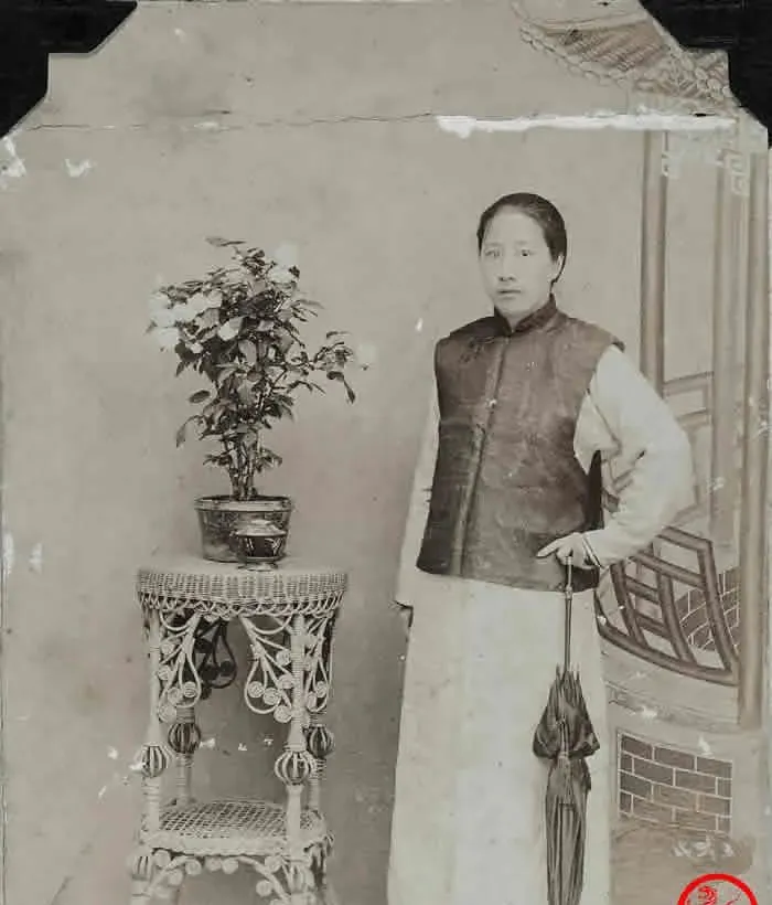 这张里的人穿男装马甲,里头是长衫,手里随意挎着一把折伞,立在编花桌与小盆栽旁边,眼神正气凛凛却不咄咄,像是随口就能说出几句硬话的那种人,妈妈看见照片会嘀咕一句,人家那时讲尚武,穿不穿女装不打紧,心要硬气,现在我们倒是衣柜里一排外套,真到要站出来的时候,能说“我来”的没几个。