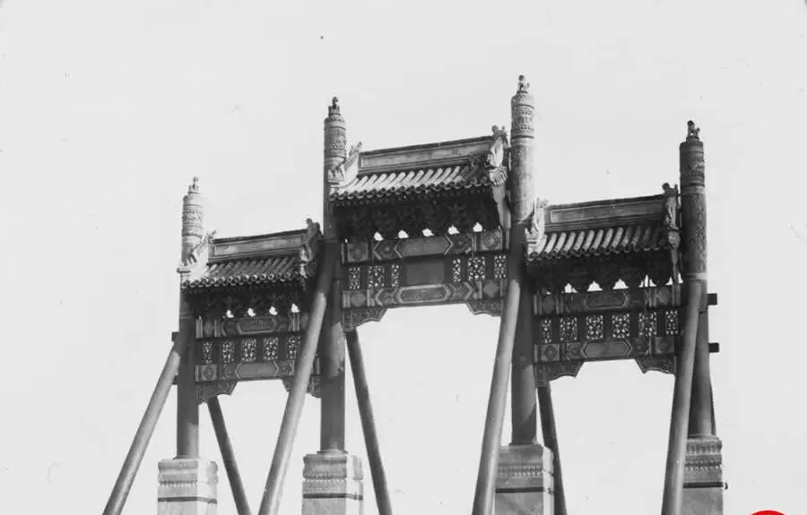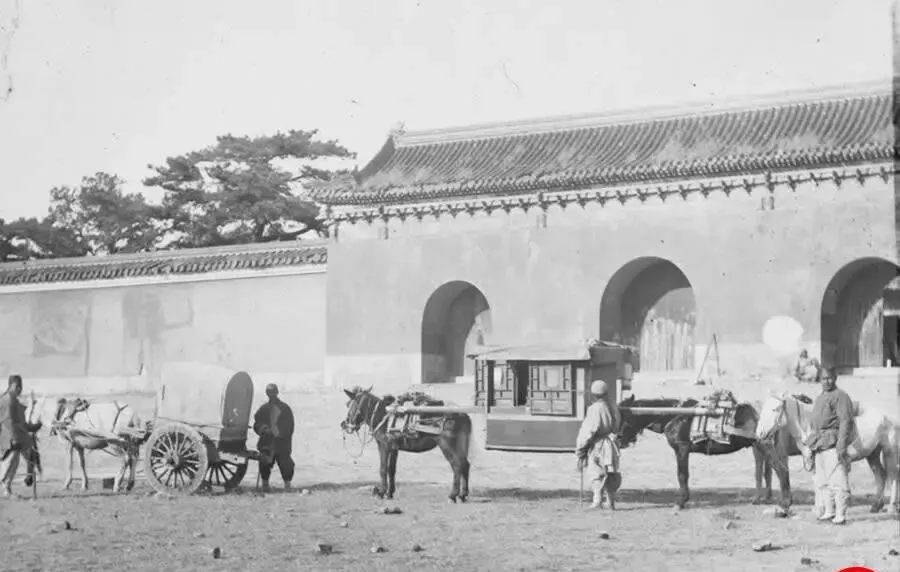 这排牲口和小轿挤在门洞前等叫门,图中这座门是明十三陵长陵的入口,三孔圆券墙厚得很,轿杠横在地上,骡背上的驮铃歪歪扭扭,想象一下,那时候外宾来此,要先在这儿照相留念,管事的延恩侯属下拿着花名册清点人数,规矩多,大家却不急,太阳底下聊几句天,等一阵影子挪过去就能进了。