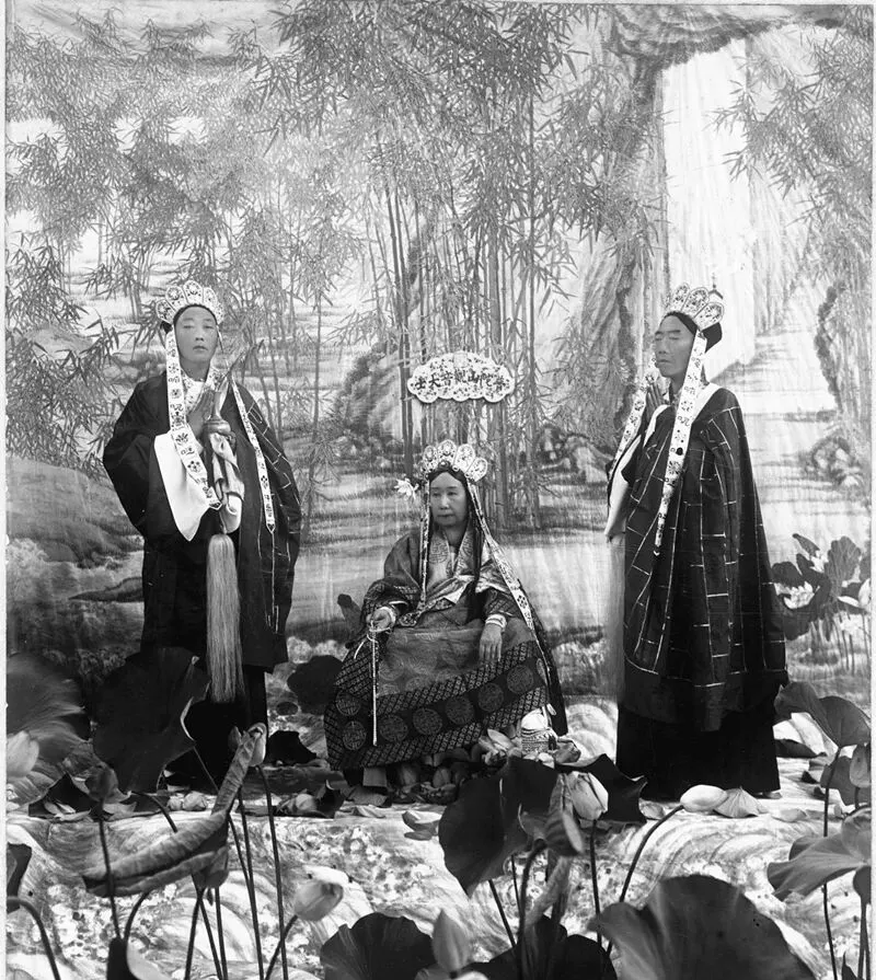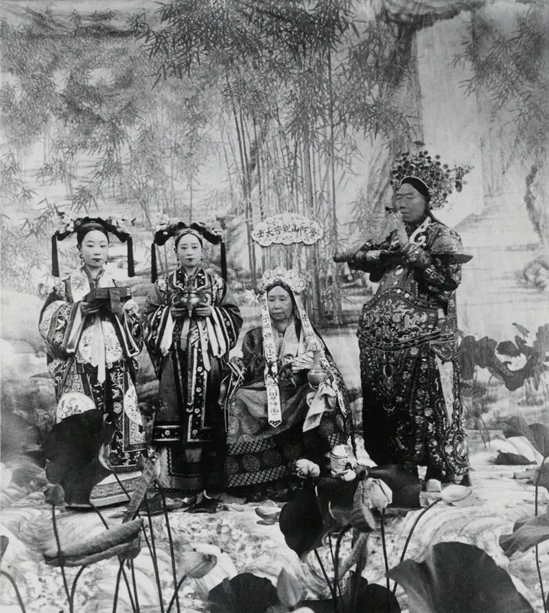 这张舞台布景明显更花,荷叶大得夸张,人物站位也更讲究,太后坐定,左右两位执器侍立,最有用的还是那条敞口领,颈间鼓起在布景的阴影衬托下更有层次,像从皮下拱出来的丘,边缘不是直线,是被呼吸轻轻托着的波纹,老照片不高清,信息却够用了。