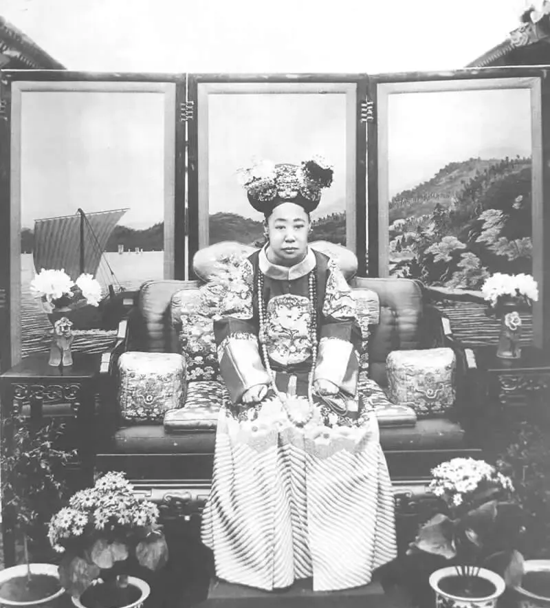 图中这位年轻的宫装女子,头上压着沉甸甸的大拉翅,颈项却不显细,圈口一勒,皮肉在边上轻轻起包,扶着衣襟的手胖而紧,嘴唇鼓鼓,像是总要喘上一口,单看一张照片不能妄断什么,可这样的轮廓在那代人里并不稀罕,这也是当时生活饮食和环境的印子。
