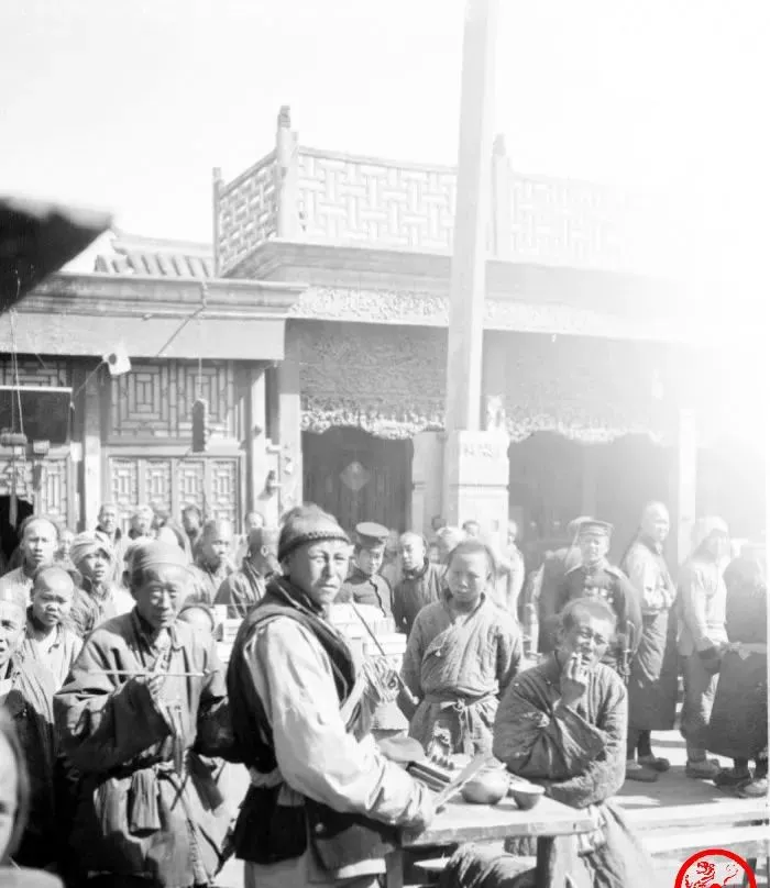 图里凑过来的人都在打量镜头,嘴角叼着旱烟杆的几位神色自若,也有夹着纸烟的,样子新鲜些,桌上摆着小碟和茶盅,摊主手里像是在切什么下酒菜,阳光从屋檐斜斜地洒下来,尘土里飘着油香。