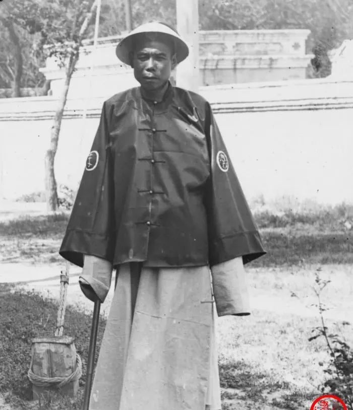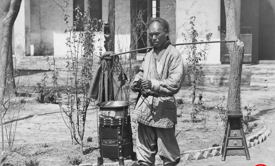 这个肩上拴着长扁担的叫剃头匠,前头挑着小火炉和水盆,是热的一头,后头架着折凳和工具格,是凉的一头,剪刀推子直尺全在夹层里,客人一坐,小布一围,先烫毛巾再动刀,**“剃头挑子一头热”**这句话就这么来的。
