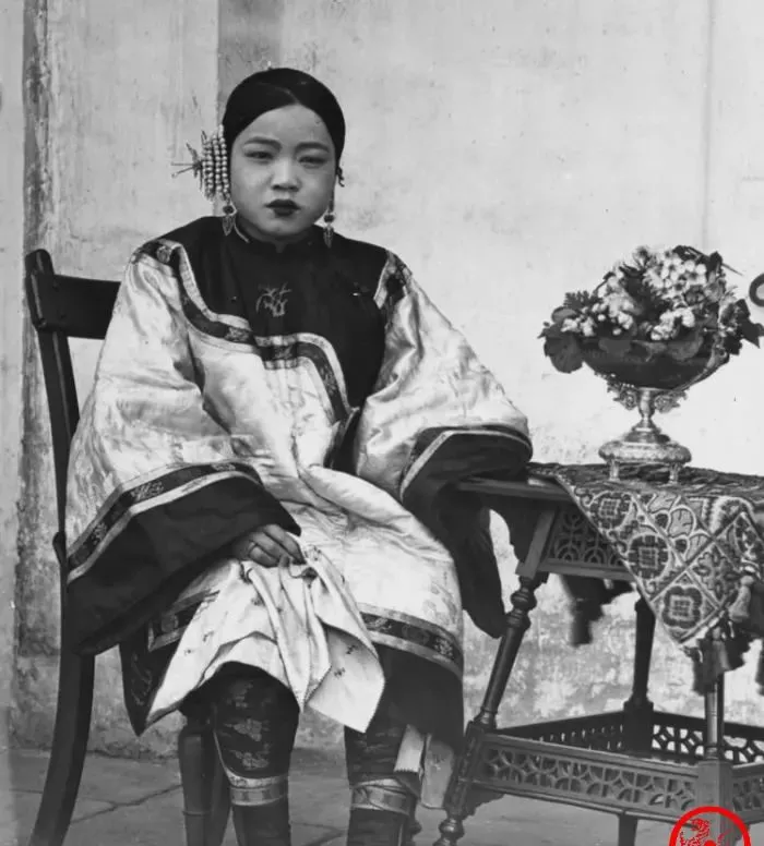 这个坐姿端端正正的叫小脚女子,丝绸衣料光可鉴人,耳边坠着串珠,桌上摆花,脚下三寸金莲被绣袜包得密不透风,腿上绑带一层压一层,样子体面,站起来就难了。