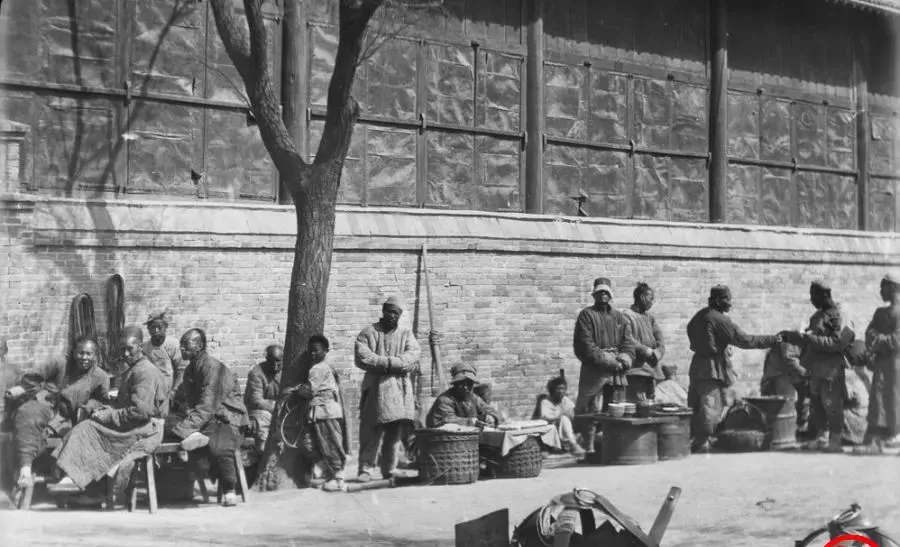 这个长镜头就是崇文门大街,街面全是土,车辙一道一道,雨后准得翻浆,屋檐下挂着幌子,卖饭的卖布的挤在路边占道搭着棚,远处的烟囱和旗杆把天线拉得很高,热闹是热闹,规矩也真松散。