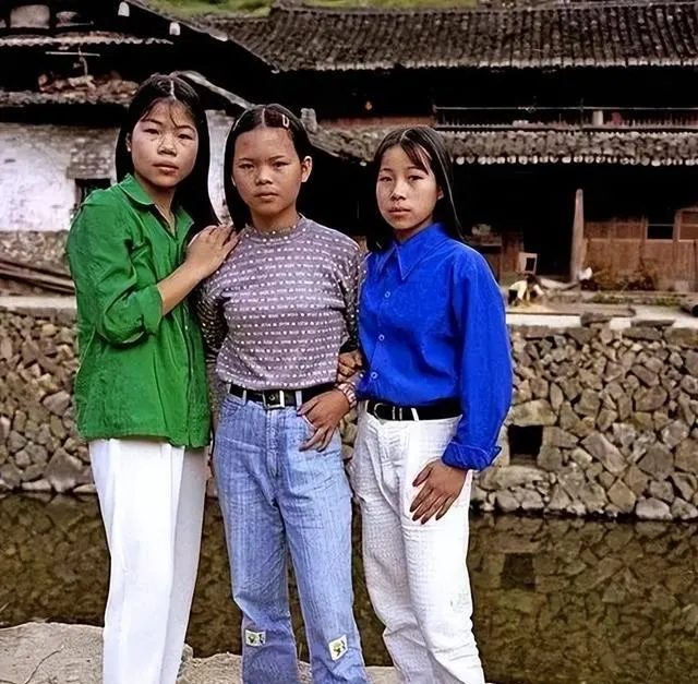 这三位一绿一蓝一灰,衬衫配白裤牛仔裤,腰上都扎了皮带,发卡别得直直的,塘边站着就有股气儿,那会儿镇里来了照相馆,大家排队照一张志气照片,回去能压在箱底好多年。
