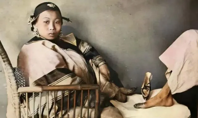 图中小脚叫三寸金莲,白布一层层缠得紧,脚背被勒成弓,坐着看还算体面,真要走起路来步子碎得像敲子,娘说以前新鞋要提前捂汗,不然磨得掉泪,现在谁还受这苦。