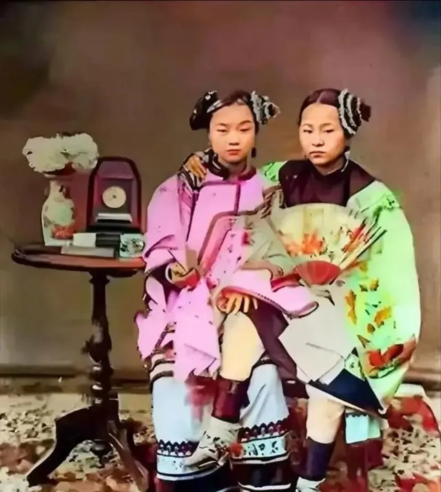 这张房里摆了台钟,桌上搁扇面,两个姑娘衣摆绣得花团锦簇,袖口里垫衬撑得鼓鼓的,拍照要定住不眨眼,师傅念叨别动别动,姿势一端就是一辈子的样子。