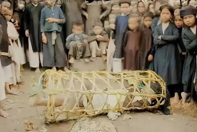 这张最扎心,竹篾扎的笼子细而密,女人被捆着塞进去,四周人围得严严的,有的皱眉有的看热闹,旧时说是不守妇道要以此惩戒,落到水里就只能慢慢下沉,这等规矩,想都不敢想。
