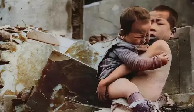 这张最让人心紧,小的哭得上气不接下气,老大把人一把抱住,衣袖上糊着灰,身后是倒的墙和烂玻璃,没爹娘的消息,只能先把弟弟护好了再说。