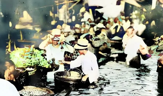 这画面有点戏剧,水已经漫到腰,卖菜的还在吆喝,男人戴草帽端着一筐鱼,女人把裤脚拎到大腿,日子再难也要过下去,这句在照片里被说得最透。