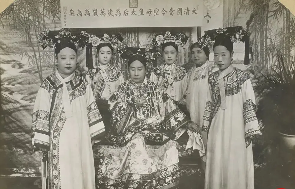 图中这排站得端端正正的女子叫清末宫嫔群像,中间坐着的位份最高,前后摆着屏风和绣墩,发饰是旗头大拉翅,黑漆底上钉着珠花和绒花,镜头一按,脸上不笑也不怒,全是规矩写在脸上,老照片的味道就从这种僵硬里冒出来了。