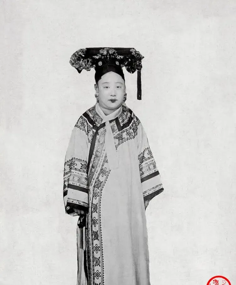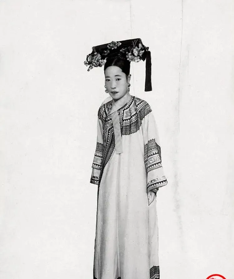 图中这位身量窄长,旗装是浅底重纹的袍子,袖口滚了两道粗边,腰际松垮垮地垂着系带,脸颊消瘦,脖颈细长,站在白背景前更显单薄,奶奶看了照片就说,这样的人在宫里多半心事重,衣裳再宽也裹不住风。