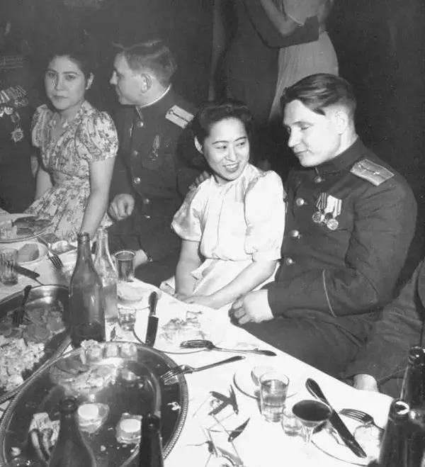 1946年3月,沈阳,两个苏联红军军官一人一个搂抱着中国和日本女孩,他们喝得酩汀大醉。