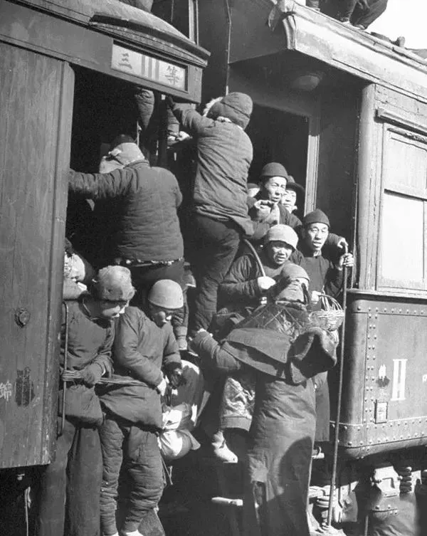 1946年3月,沈阳,三等舱门口和列车交接处坐满了旅客。