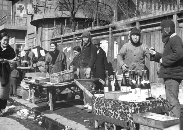 1946年3月,沈阳,一群贫困的日本小贩正在出售酒精饮料。