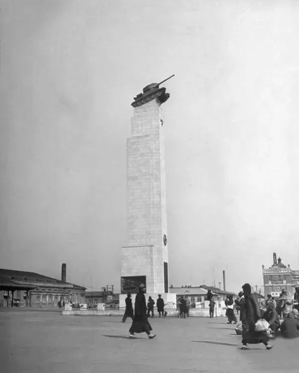 1946年3月,沈阳市中心,苏联人树立了一座高耸入云的纪念塔,塔顶上放置的是苏联坦克,以纪念满洲战役和宣示苏联对满洲国地区的占领。