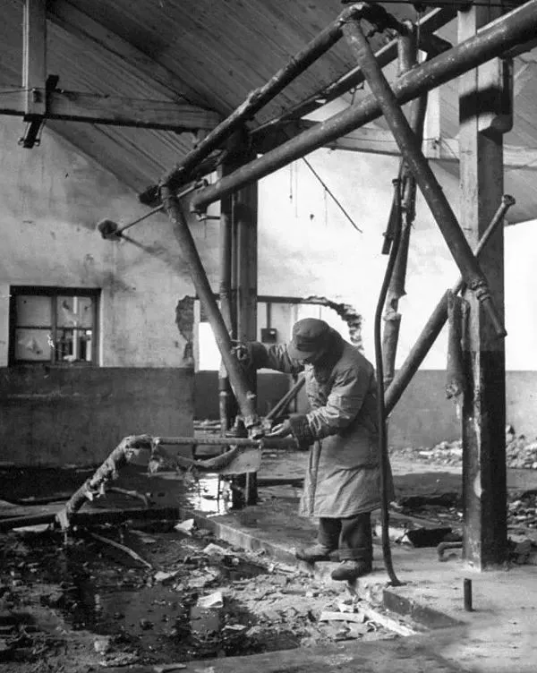 1946年3月,沈阳,原来的一家大型日本人开办的橡胶厂,苏联搬走了所有的机器和设备后把它焚烧掉,但一些搬不走的大型的机器设备清晰可见。